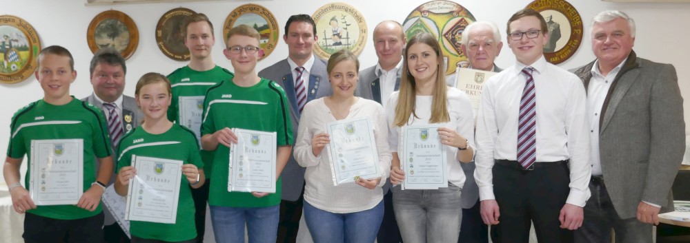 Bürgermeister Ludwig Waas hob in seinem Grußwort hervor, dass er auch an diesem Abend wieder erfolgreiche Jugendarbeit der Hubertus-Schützen sehen könne. Zum einen in den sportlichen Erfolgen und zum anderen in der Tatsache, dass Jung und Alt bei den gesellschaftlichen Veranstaltungen teilnehmen. Die Gemeinde werde die Vereine da auch weiter konsequent unterstützen, versprach er. Denn es sei wichtig, dass in der Gemeinde sinnvolle Freizeitgestaltung angeboten werde. Bei den Scheibenschießen, so Schützenmeister Hans Zollner weiter, komme es auch auf das nötige Quäntchen Glück an. Matthias Platz hatte dies bei der Blattlscheibe mit einem 1,3 Teiler vor Magdalena Schneid (2,0 Teiler) und Josef Hiendl junior (5,2 Teiler). Die Jugendscheibe (gestiftet von Anna Schindlmeier) gewann Magdalena Schneid (18,2 Teiler) vor Sina Loibl (23 Teiler) und Florian Ehrl 32,8 (Teiler). Die glückliche Siegerin der Jahresfestscheibe (gestiftet Matthias Platz) war Sandra Zollner (20,3 Teiler) vor Josef Bayerl (20,7 Teiler) und Hans Zollner (23,2 Teiler). Von den Mitgliedern besonders mit Spannung erwartet wurden die Ergebnisse des Königsschießens, das nur mit einem Schuss ausgetragen wird. Die bisherige Jugendschützenkönigin war auch die neue: Mit einem 206,1 Teiler darf Magdalena Schneid die Jugendkönigskette ein weiteres Jahr behalten. Wurstkönig wurde Lukas Weiß und Brezenkönigin Leonie Ring. Bei den Erwachsenen wurde Petra Bachl mit einem 96,4 Teiler neue Schützenkönigin und bekam von der Vorgängerin Kerstin Hiendl die Königskette umgehängt. Mit der Wurstkette wurde Matthias Platz bedacht, Josef Hiendl junior erhielt die Brezenkette und Margit Schneid wurde Baungkönigin. Die Schützenliesl-Scheibe gewann Magdalena Müller. Schützenmeister Zollner gab zum Abschluss noch einige Informationen an die Mitglieder weiter. So soll eine neue Trachtenjacke für Männer angeschafft werden. Weiter verschaffe man sich zur Zeit einen Überblick über elektronische Schießanlagen. Für das erste Septemberwochenende 2020 werde ein Dreitagesausflug geplant. Weiter wies er auf die Dorfweihnacht der Feuerwehr am 30.11.19 und auf das traditionelle Nussschießen am 28.12.19 hin. Mit dem Dank an alle Mithelfer im Verein schloss der Schützenmeister die Feier ab. |