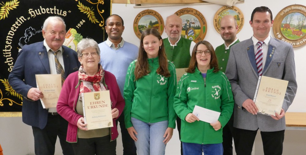 Jahresschießen Zweiter Schützenmeister Hans Zollner führte dann über zu den Ergebnissen des Jahresschießens. Die besten Drei bei der Jugend waren 1. Laura Altmann, 2. Elias Altmann, 3. Selina Kroiß, bei den Erwachsenen Lukas Weiß, Josef Hiendl senior und Erich Schindlmeier. Scheibengewinner Weiter ging es mit den Blattlschießen. Hier sei, so Zollner, neben dem Können auch stärker das Glück notwendig, um zu gewinnen. Bei der Blattlscheibe gewann Julian Loibl mit einem 2,2 Teiler vor Andreas Hiendl 3,8 Teiler und Anna Schindlmeier 4,2 Teiler. Die Jugendscheibe (Stifterin Selina Kroiß) gewann mit Quirin Lustinger 21,4 Teiler ein Neuling vor Laura Altmann (39,4 Teiler) und Maya Seidl (44,9 Teiler). Die Jahresfestscheibe (Stifterin Sophia Göggelmann) konnte mit einem 7,0 Teiler Petra Bachl in Empfang nehmen, 2. Platz Julia Bergbauer 9,4 Teiler und 3. Platz Andreas Bachl 22,2 Teiler. Schützenkönige Wie immer war man besonders auf die Ergebnisse des Königsschießens (jeweils nur 1 Schuss) gespannt. Ex-Jugendschützenkönig Jonas Wagensohn übergab die Königskette an die neue Jugendschützenkönigin Selina Kroiß (78,5 Teiler). Die Wurstkette erhielt Quirin Lustinger (241 Teiler) und die Brezenkette Julian Rabl (249 Teiler). Ebenfalls unter großem Jubel wie bei der Jugend nahm Sophia Göggelmann (87,1 Teiler) die Königskette von ihrem Vorgänger Erich Schindlmeier in Empfang. An Johann Staudinger (175,6 Teiler) übergab er die Wurstkette, an Andreas Bachl (196,1 Teiler) die Brezenkette. Erich Schindlmeier wurde der „Baung-König“ (228 Teiler). Ex-Schützenliesl Sophia Göggelmann kürte schließlich mit der Übergabe eines Diadems und der Liesl-Scheibe Petra Bachl als neue Schützenliesl. Mit einem dreifachen „Hoch soll’n sie leben“ endete die Königsproklamation der Hubertus Schützen.